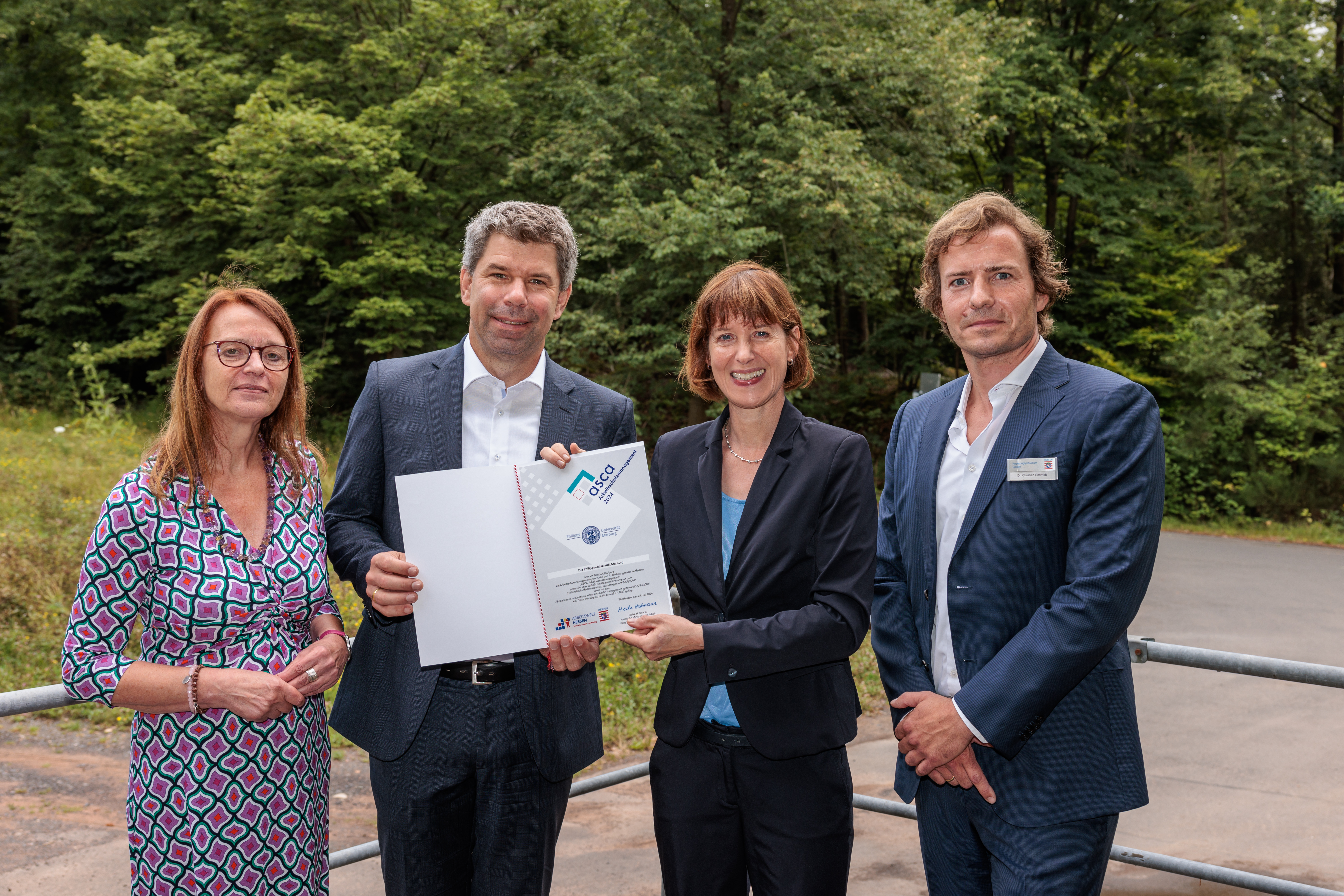 Verleihung der ASCA-Urkunde an der Philipps-Universität mit (von links): Dr. Annette Biederbick (Sicherheitsreferentin Uni Marburg), Prof. Thomas Nauss (Universitätspräsident), Ministerin Heike Hofmann und Dr. Christian Schmidt (Regierungspräsidium Gießen) Foto: Jan Bosch