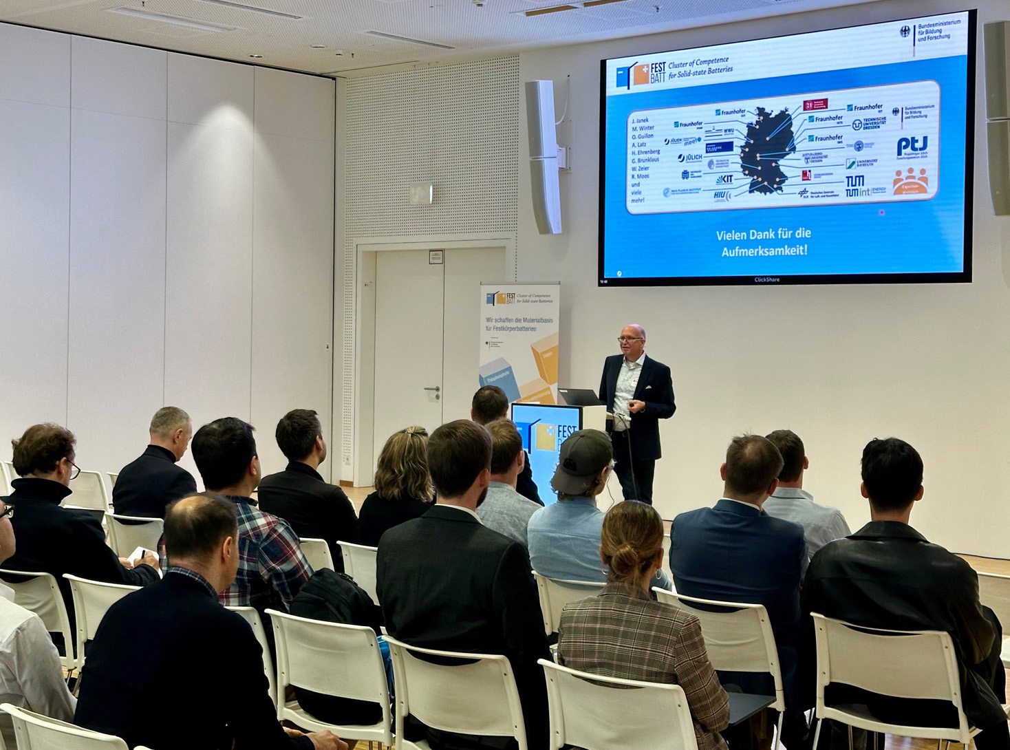 Erfolgreiche Batterieforschung: Der Leiter des Forschungsclusters FestBatt Prof. Jürgen Janek vom Physikalisch-Chemischen Institut der Justus-Liebig-Universität Gießen (JLU) gibt einen Überblick über den aktuellen Forschungsstand. Foto: Thomas Leichtweiß.
