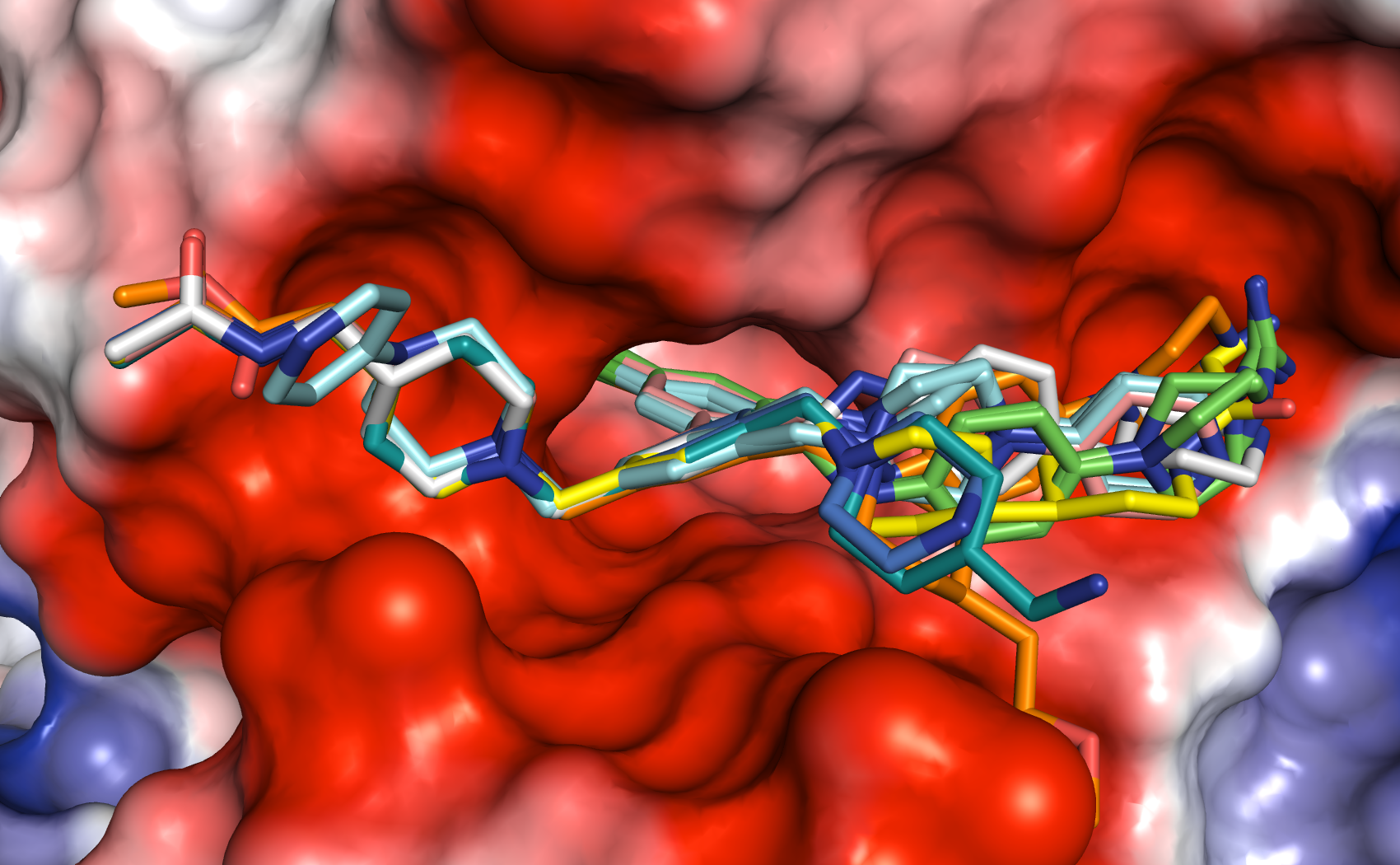Kristallstruktur des aktiven Zentrums der humanen Virus-aktivierenden Wirtsprotease Furin im Komplex mit verschiedenen nichtpeptidischen Hemmstoffen, die im Arbeitskreis Steinmetzer synthetisiert wurden. Die Furinoberfläche ist entsprechend ihres elektrostatischen Potentials mit negativ geladenen Bereichen in rot, neutralen in weiß und positiv geladenen Regionen in blau dargestellt. Die Inhibitoren sind als unterschiedlich eingefärbte Stabmodelle gezeigt. Die Kristallstrukturen wurden durch Sven O. Dahms (Paris Lodron Universität Salzburg) bestimmt. Bild: Torsten Steinmetzer.