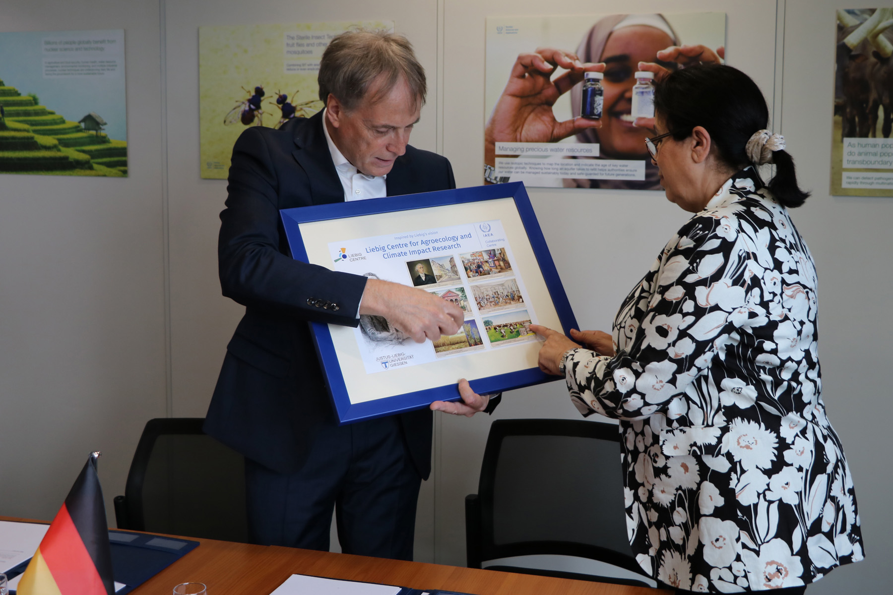Agrarökologie und Klimafolgenforschung stehen im neu gegründeten „Liebig Centre” im Fokus. Prof. Dr. Christoph Müller, Institut für Pflanzenökologie der JLU (l.) und Najat Mokhtar, Deputy Director General and Head of the Department of Nuclear Sciences and Applications, tauschen sich in Wien über die gemeinsamen Forschungsarbeiten aus. Bildnachweis: IAEA.