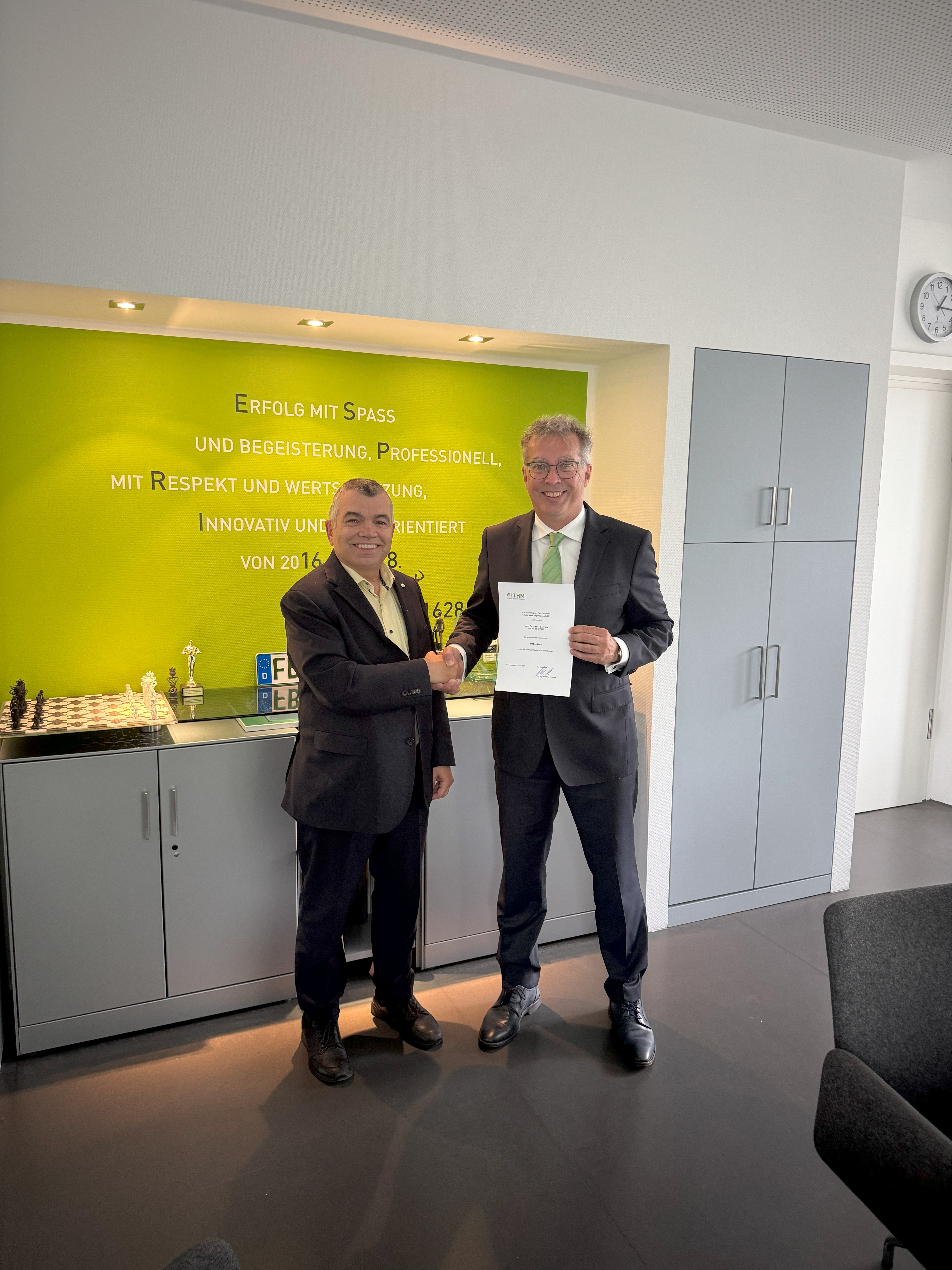 THM-Präsident Prof. Dr. Matthias Willems (l.) bestellt Dr. Detlef Behrens zum Honorarprofessor am Fachbereich Life Science Engineering. Bildnachweis: THM.
