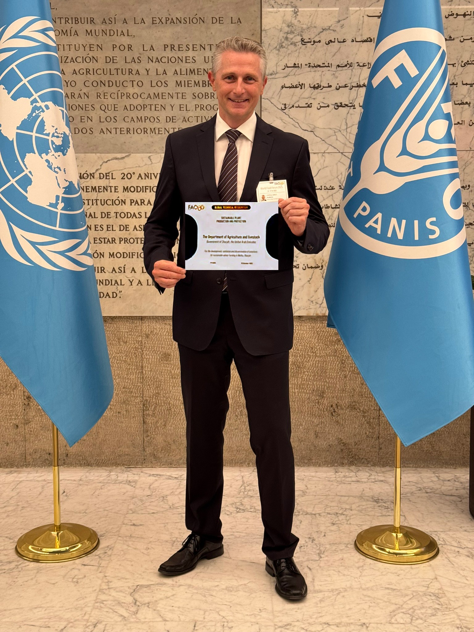 Prof. Dr. Marc F. Schetelig hat den Global Technical Recognition Award der FAO in der Kategorie „Nachhaltige Pflanzenproduktion und Pflanzenschutz“ in Rom erhalten. Bildnachweis: Kostas Bourtzis.