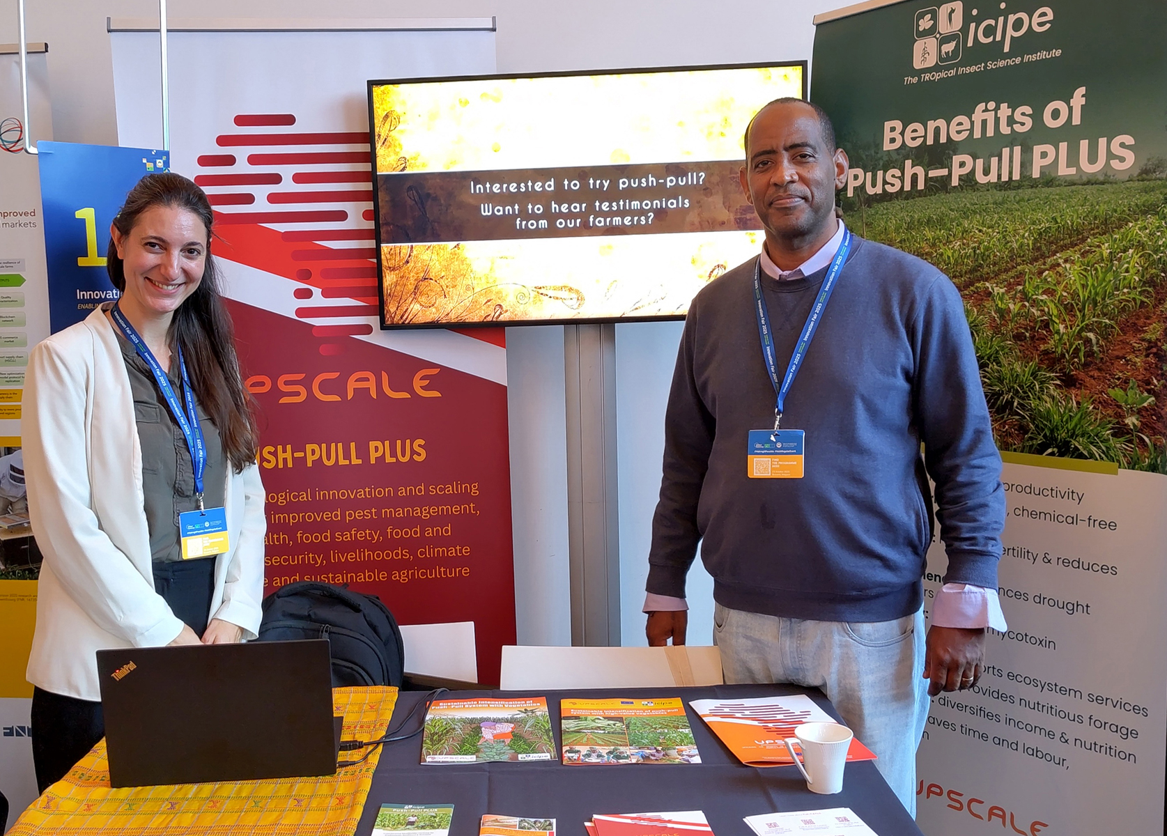 Prof. Dr. Emily Poppenborg Martin mit Dr. Amanuel Tamiru (International Center for Insect Physiology and Ecology, Kenia) bei der Innovationsmesse von Afrikanischer Union (AU) und EU in Brüssel, wo das Projekt UPSCALE präsentiert wurde. (Bildnachweis: E. Poppenborg)