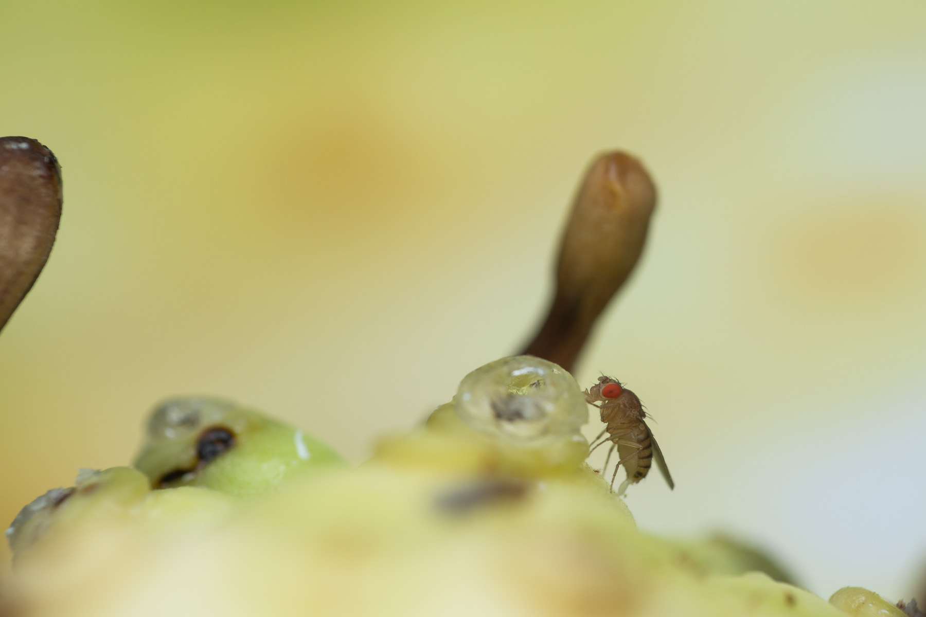 Manche mögen’s sauer: Die Fruchtfliege Drosophila sechellia auf der Noni-Frucht (Morinda citrifolia). Foto: Benjamin Fabian.