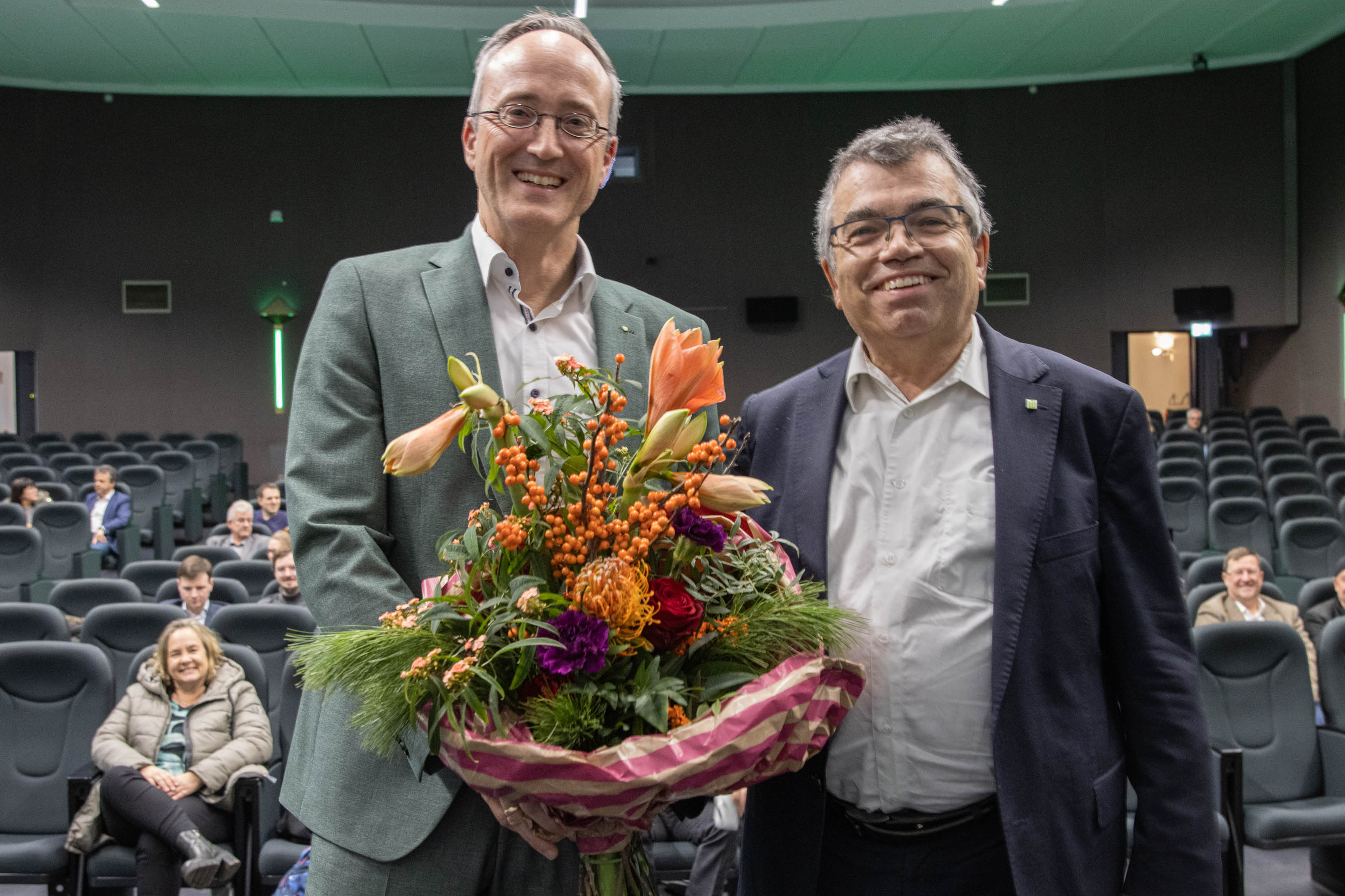 Glückwünsche von Präsident Prof. Dr. Matthias Willems (rechts): Prof. Dr.-Ing. Jochen Frey ist für eine weitere Amtszeit zum Vizepräsidenten der THM gewählt worden. Bildnachweis: THM.