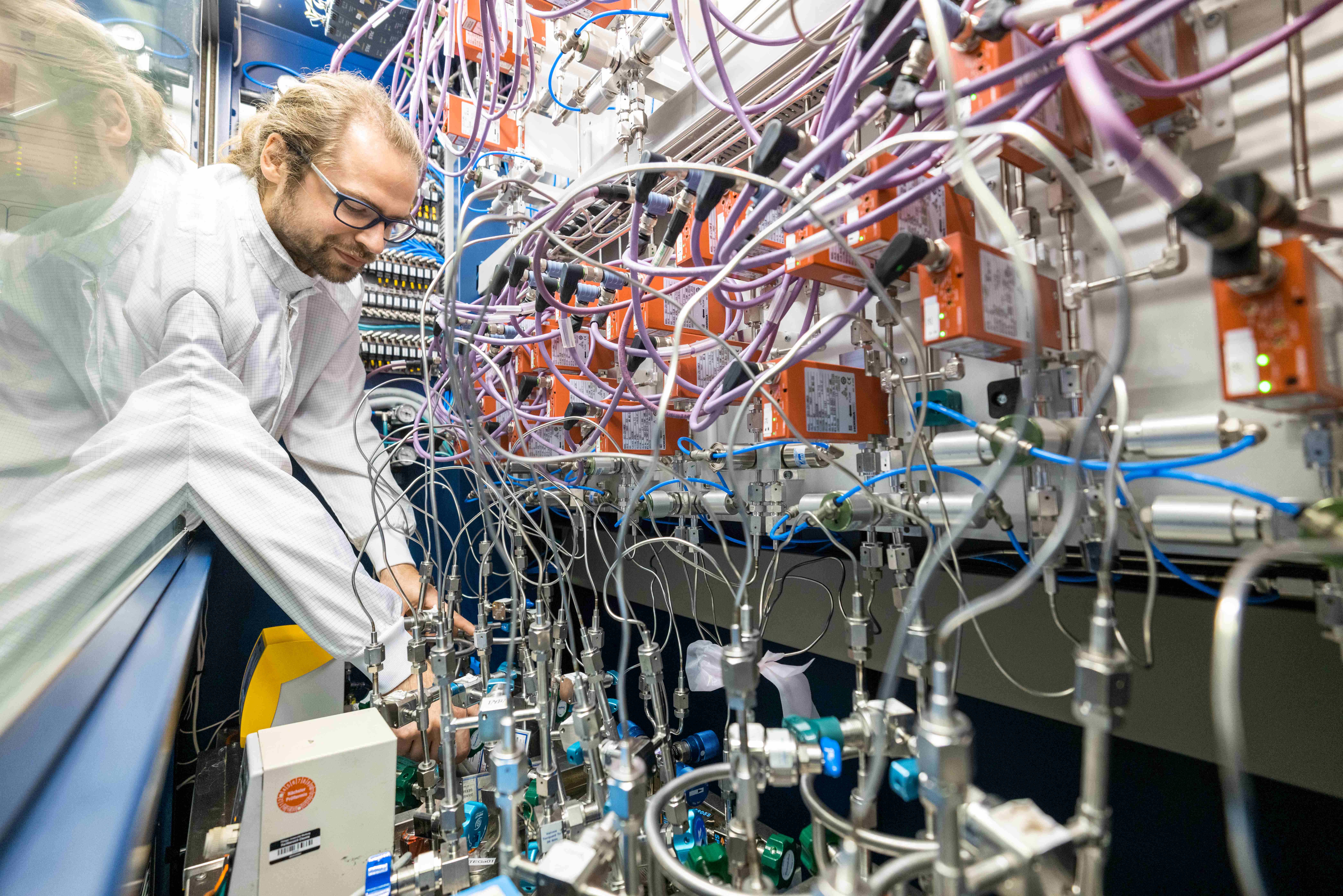 Der Marburger Physiker Marcel Kröner stellt hier die Anlage zum Aufwachsen von GaAs-Halbleiterlaserschichten ein. Bildnachweis: Ralf Niggemann.