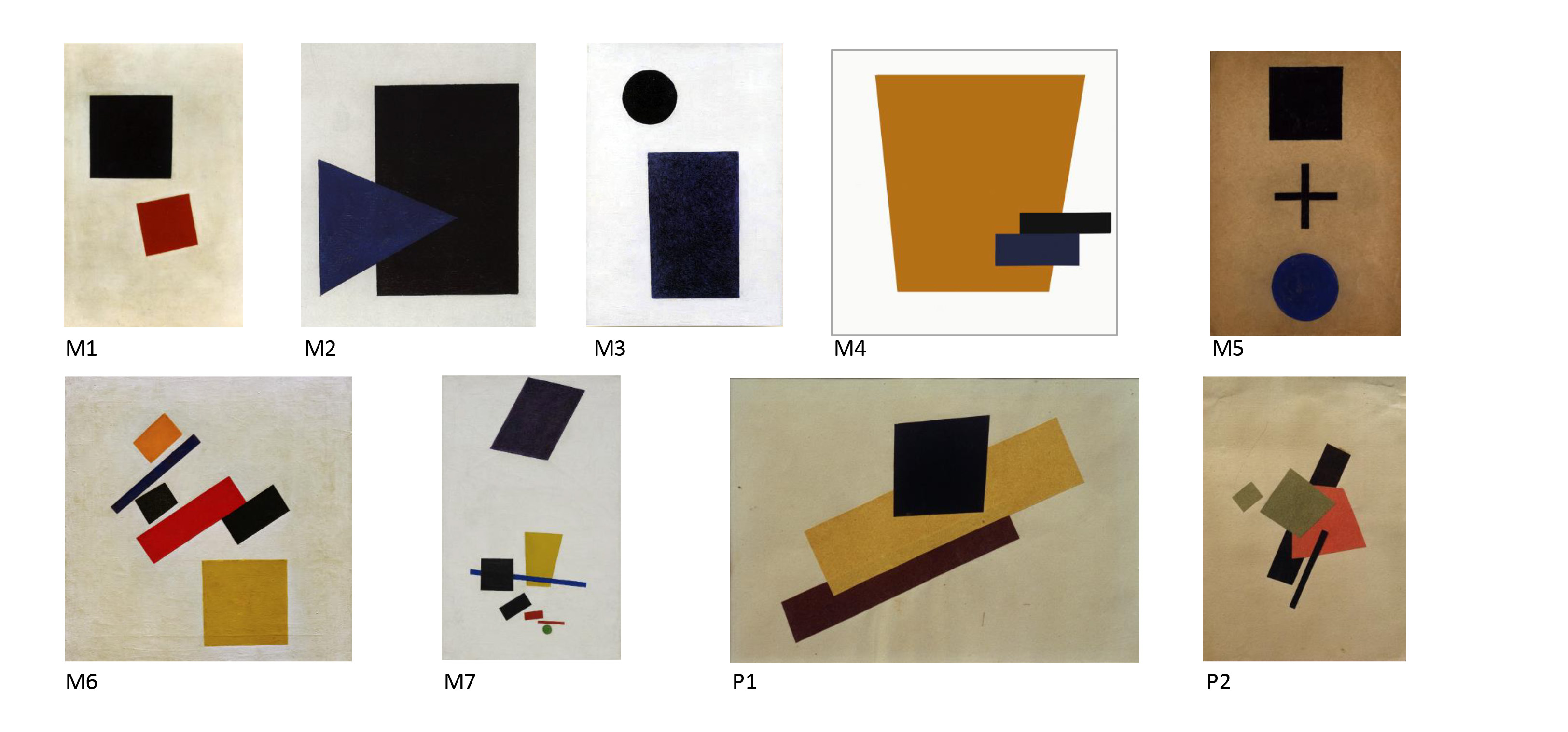 Digitale Bilder der verwendeten suprematistischen Kunstwerke des Künstlers Kasimir Malewitsch (M1-M7) und der Künstlerin Ljubow Sergejewna Popowa (P1-P2). Bildnachweis: Dr. Doris Braun und Prof. Katja Dörschner-Boyaci, Ph.D.
