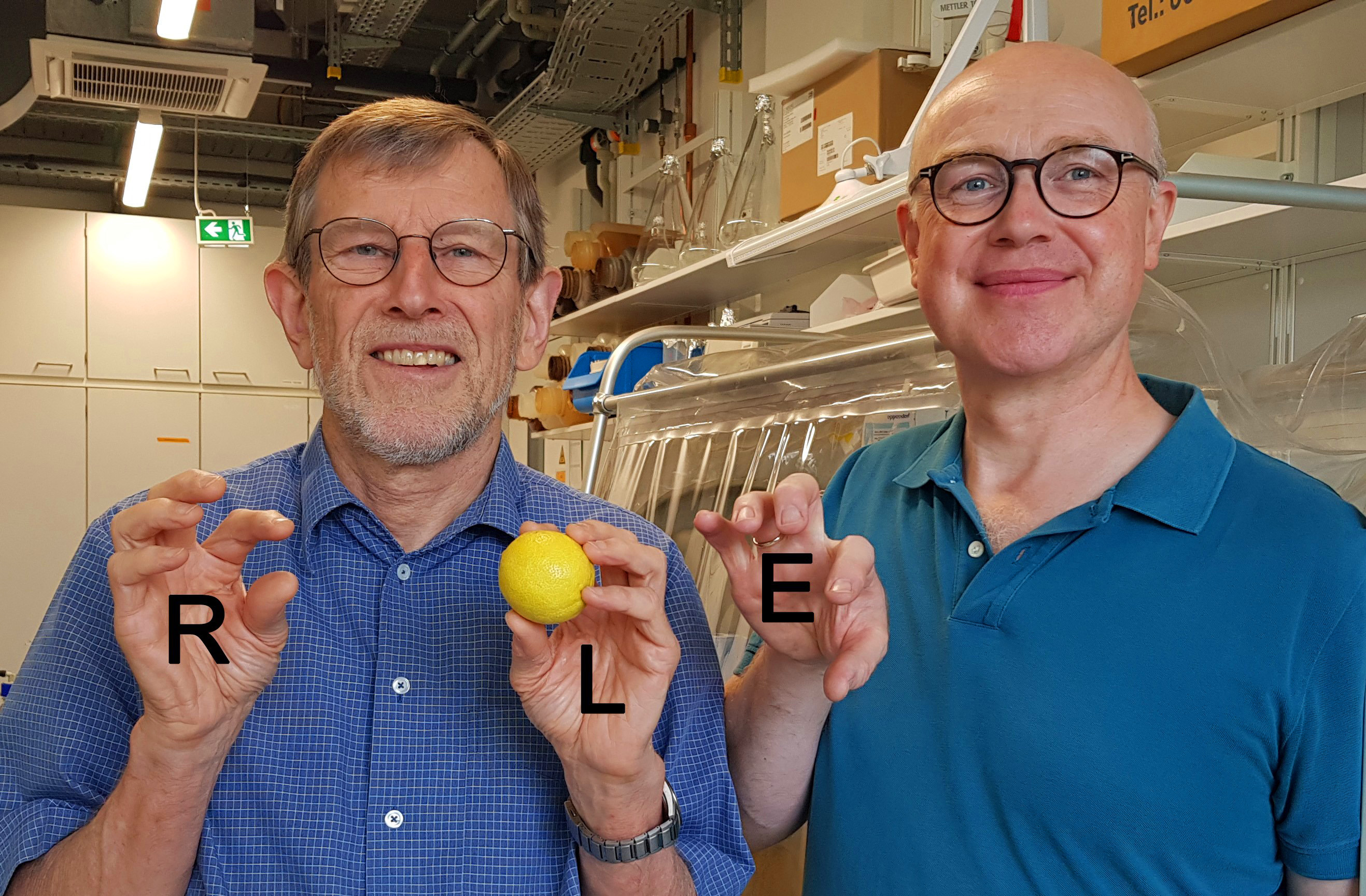 In der Abbildung zeigen Roland Lill (links) und Oliver Stehling exemplarisch, wie D-Cystein toxisch in Zellen wirkt: Normalerweise wird der gelbe Schwefel von der linken Hand (L) an eine Empfängerposition im Enzym (E) übertragen. Sitzt der gelbe Schwefel allerdings in der rechten Hand (R), ist die Entfernung zur Empfängerposition zu groß. Als Folge kann die für die Zelle lebenswichtige Übertragungsreaktion nicht stattfinden und die Zelle stirbt. Foto: Carina Beimborn; Bearbeitung: Roland Lill.
