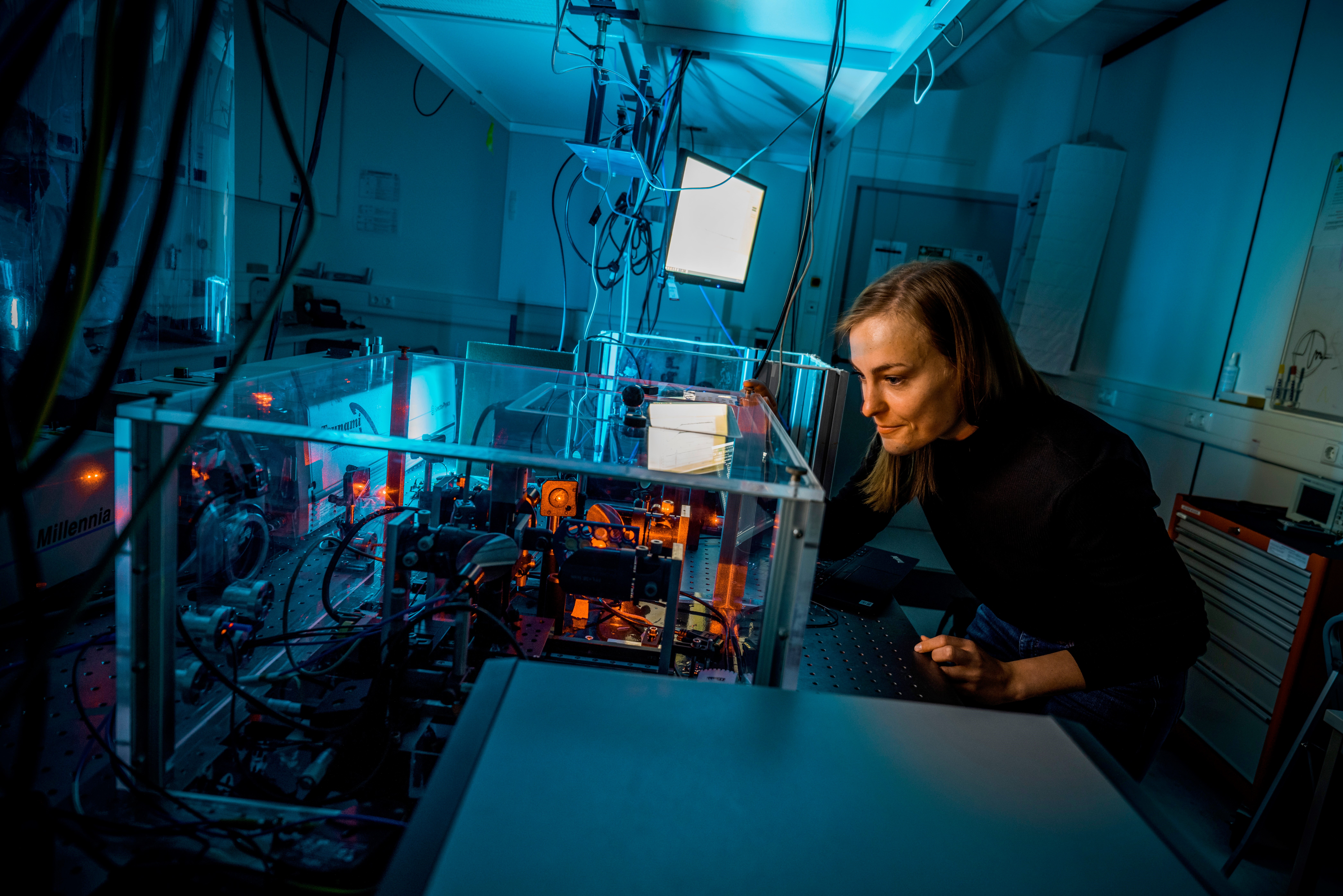 Martin Kochs Mitarbeiterin Lara Heidrich mit ihrem optoelektronischen Terahertz-Messsystem (Foto: Jan Hosan)